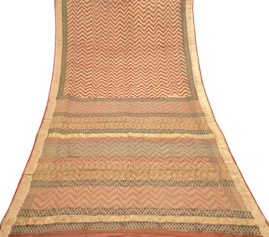Indian Vintage Beige Pure Chanderi Silk Saree Block Printed Floral Design, Zari Border 6 Yards Craft Fabric for Upcycling, Dressmaking