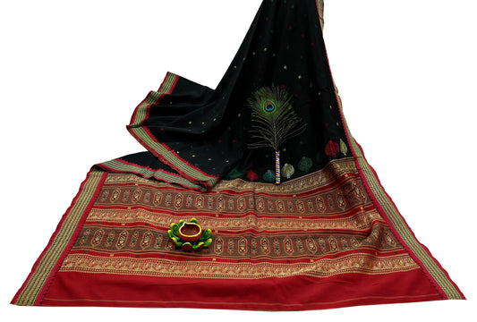 Indian Vintage Sari Black & Red Artificial Silk Hand Woven Saree Fabric 5yd Sewing Craft Dress Making Soft Floral Ethnic