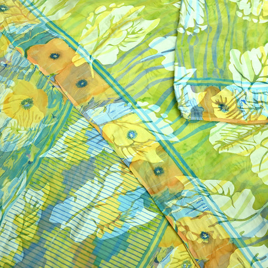 Indian Vintage Sari Gray & Yellow Pure Georgette Silk Printed Sarees 5Yd Craft Fabric Sewing Quilting Dress making Crafting Quilting Upcycle