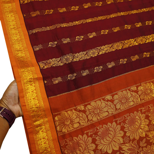 Indian Vintage Heavy Saree Maroon & Saffron Hand Woven Kanjivaram 100% Pure Silk Sari Craft Fabric 5Yd Ethnic Zari Floral