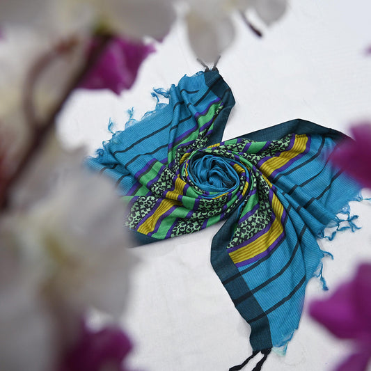 Indian Vintage Ivory & Blue Dupatta Long Stole Block Print Pure Cotton Silk Scarves Veil Soft Floral Design