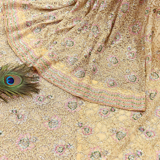 Pre-owned Yellow Georgette Silk & Net Heavy Embroidered Saree, Abu Jani Designer Sari, Bridal Wedding Wear, Hand Zardozi Sequin 5Yd
