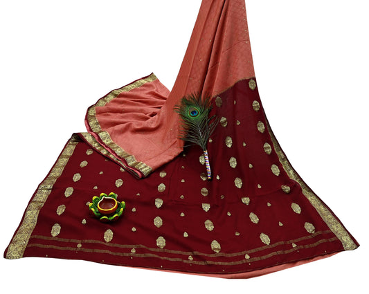Indian Vintage Sari Maroon & Peach Mysore Silk Woven Saree with Zari Border | 5 Yards | Soft Craft Fabric | Upcycle, Quilting, Dressmaking