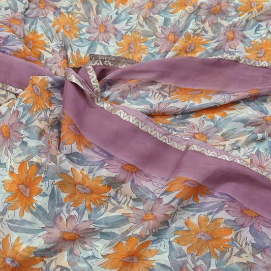 Indian Vintage Pure Chiffon Silk Saree | Printed Floral Design | 5 Yards | Sheer Soft Fabric for Sewing, Dressmaking, Craft Projects, Zari