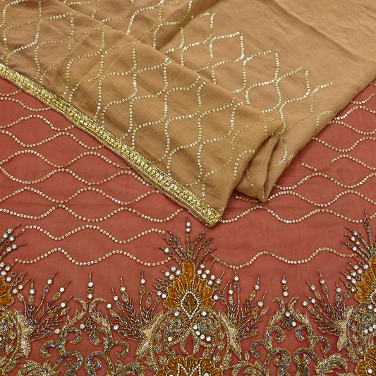 Indian Vintage Sari Rusty Orange & Beige Pure Georgette Silk/Net Hand Beaded Sarees Fabric 6Yd Sewing Ethnic Dress making Quilting Bollywood