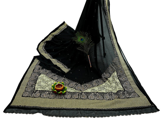 Indian Vintage Black Saree Georgette Hand Embroidered Sari Craft Fabric 5Yd Sewing Soft Ethnic Dress making Crafting Quilting Dabka