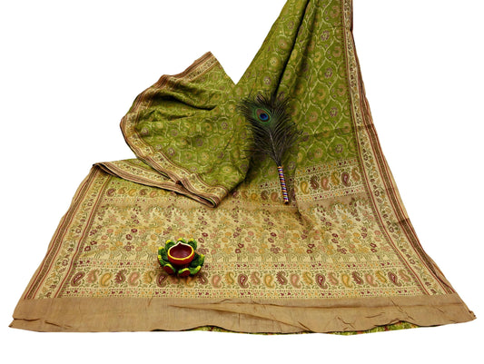Indian Vintage Sari Green & Beige Pure Tussar Silk Hand Woven Sarees Craft Fabric 5Yd Sewing Ethnic Paisley Dress Making For Crafting