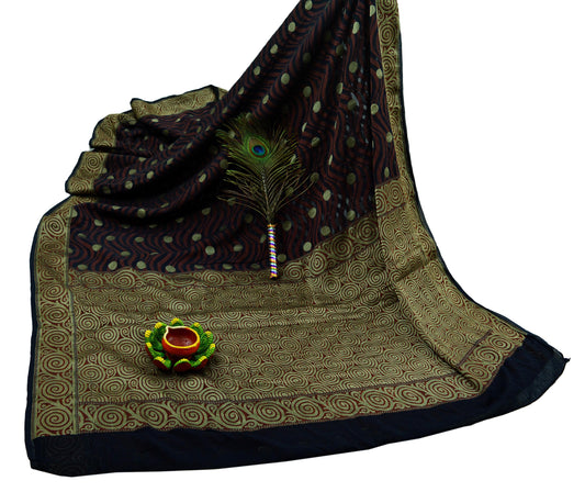 Indian Vintage Sari Brown & Green 100% Pure Silk Printed Sarees Craft Fabric 6yd Sewing Dress Making Soft Wrap Crafting Quilting
