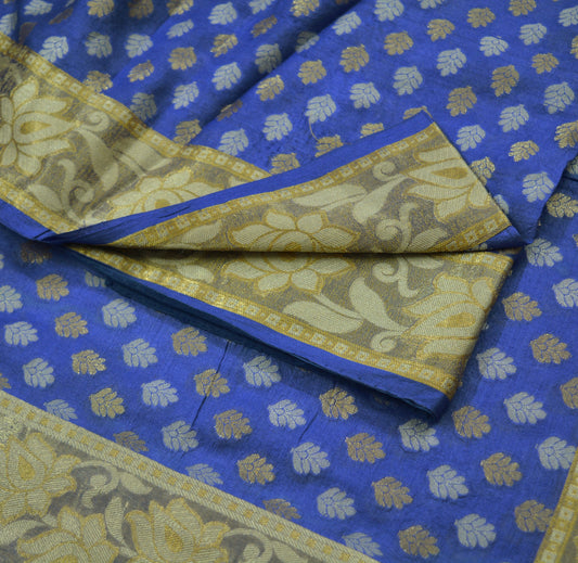 Indian Vintage Sari Blue Pure Tussar Silk Hand Woven Sarees Fabric 5Yard Sewing Ethnic Floral