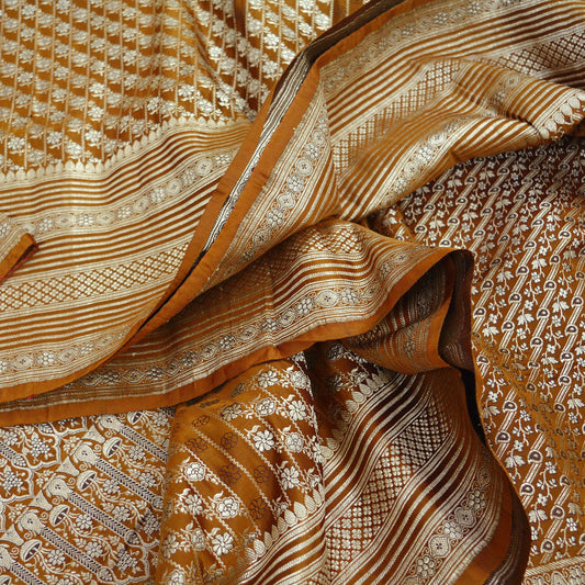 Indian Vintage Heavy Wedding Sari Saffron Pure Satin Silk Woven Brocade Banarasi Sarees Zari 5Yd Bridal Zari Sari Dress making Crafting