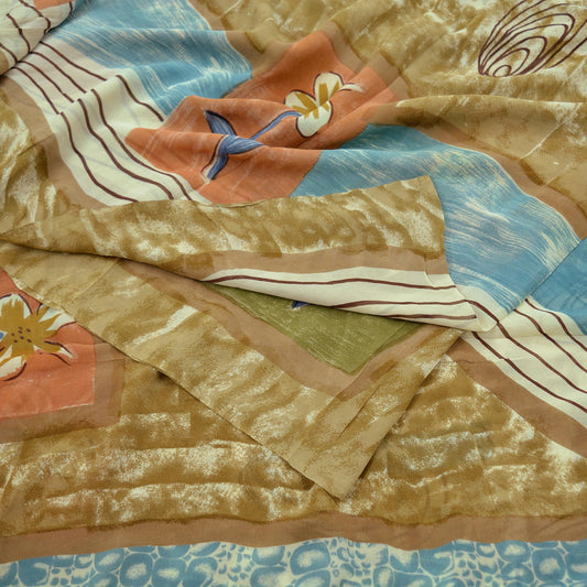 Indian Women Vintage Sari Brown & Orange Blend Georgette Printed Saree Sewing 5yard Soft Craft Floral Design Wrap Boho