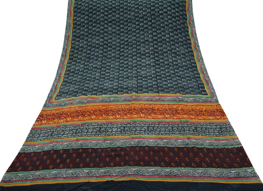 Indian Vintage Green Saree Printed Pure Cotton Sari Craft Fabric Soft 5Yd Sewing Sarong Wrap Boho Floral Dress making Crafting Quilting