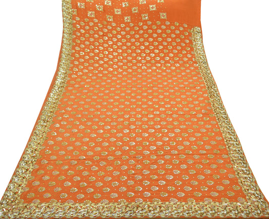 Indian Vintage Orange Saree Pure Crepe Silk Hand Embroidered Sari Craft Fabric 5Yd Sewing Soft Zardozi/Dabka Sequins Wedding/Bridal Sarees