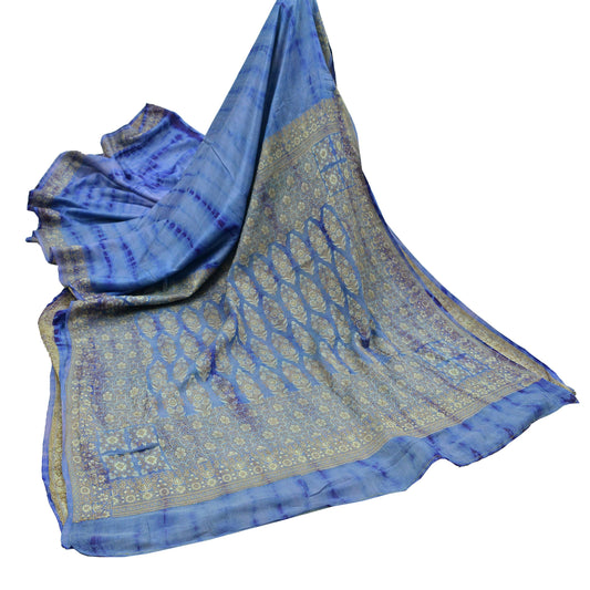 Indian Vintage Sari Blue Pure Silk Hand Woven Tie-Dye Sarees Craft Fabric 5Yd Sewing Ethnic Floral Dress making Crafting Quilting