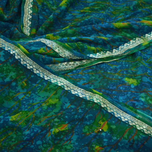 Indian Vintage Sari Blue & Green Pure Georgette Silk Hand Woven Tie Dye Zari Sarees 5Yd Craft Fabric Ethnic Upcycle Quilting Bollywood saree