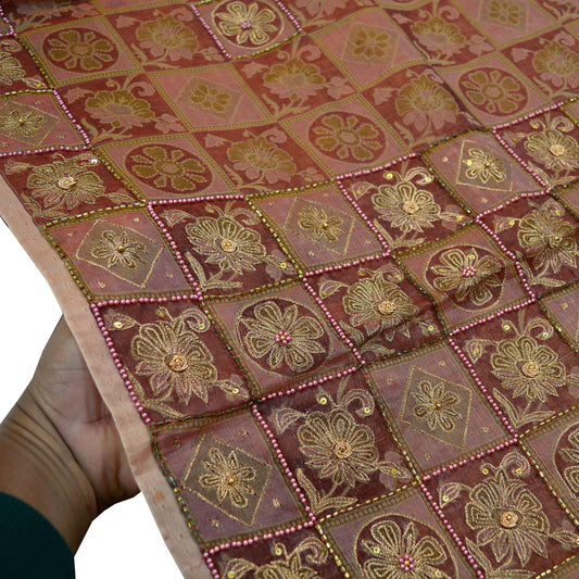 Indian Vintage Sari Brown Hand Embroidered Saree Pure Organza Silk Fabric 5Yd Ethnic Dress Making Crafting Quilting Zardozi/ Dabka
