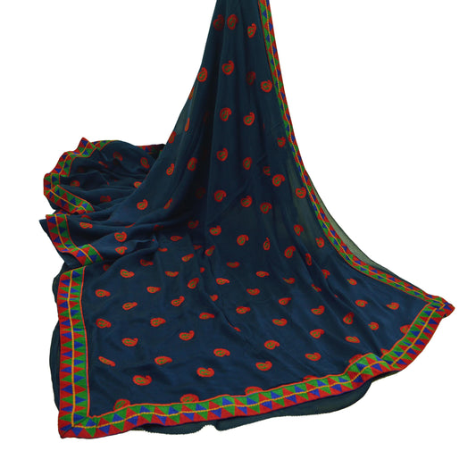Indian Vintage Saree Blue Embroidered Blend Silk Sari Fabric 6Yd Ethnic Paisley Ethnic Dress making Crafting Quilting Upcycle