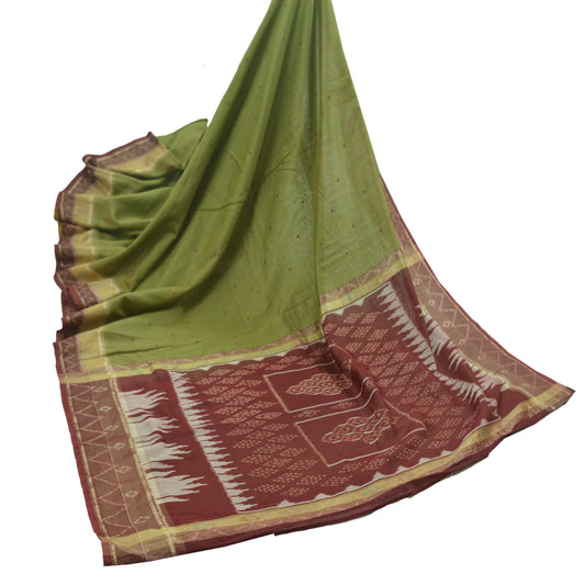Indian Vintage Sari Green Hand woven Sambalpuri Ikat Saree Pure Silk Craft Fabric 5Yd Ethnic Chackra Zari Border