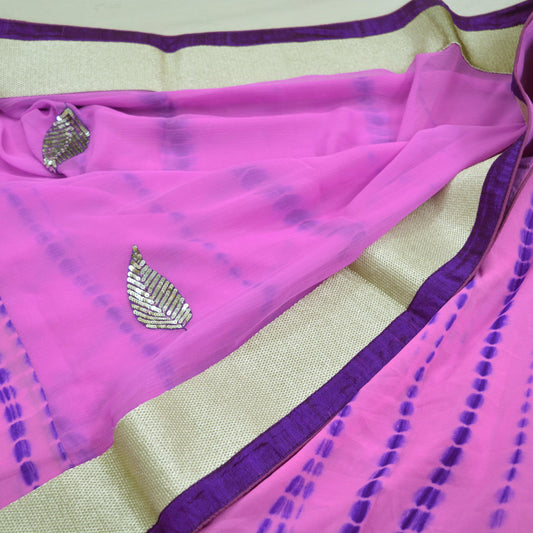Indian Vintage Purple & Pink Sarees Pure Georgette Silk Hand Embroidered Leheria Sari Craft Fabric 5Yd Sewing Soft Dress Making Sequins