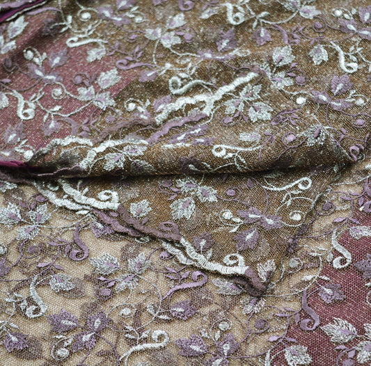 Indian Vintage Brown Saree Net/Mesh Embroidered Indian Sari Craft Fabric Floral 5Yd Zari Thread