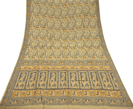 Indian Vintage Sari Beige 100% Pure Silk Hand Woven Saree 5Yd Craft Fabric Ethnic Sewing Zari Upcycle Dress Making Crafting Quilting Used