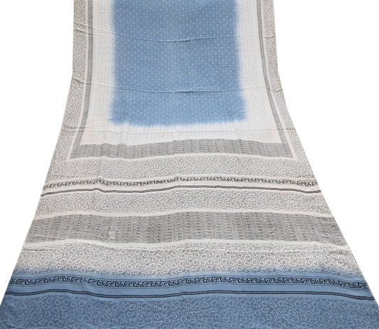 Indian Vintage Ivory & Blue Pure Silk Saree Floral Printed Fabric 5 Yards Craft Silk for Sewing, Quilting, Dressmaking, Upcycling