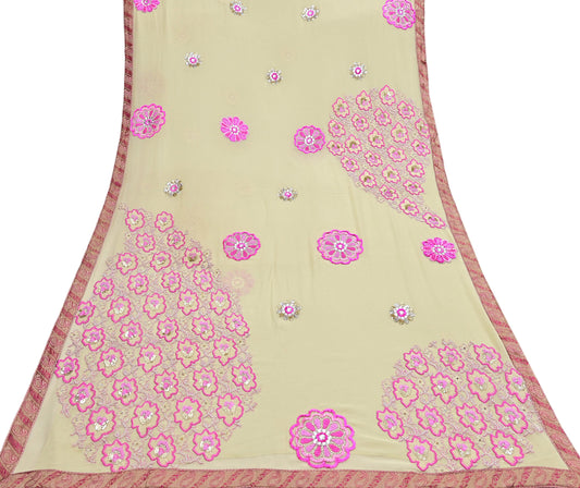 Indian Vintage Heavy Sari Ivory Pure Georgette Silk Hand Beaded Sarees Craft Fabric 5Yd Sewing Soft Ethnic Wedding Sarees Dress making