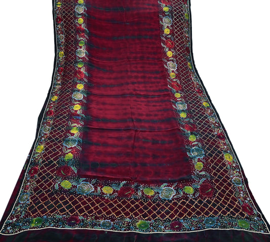 Indian Vintage Saree Maroon & Black Pure Crepe Silk Hand Embroidered Tie-Dye Sari Fabric 6yard Sewing Craft Fabric Ethnic Dressmaking