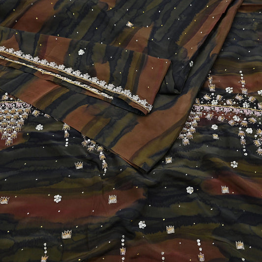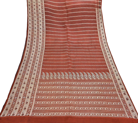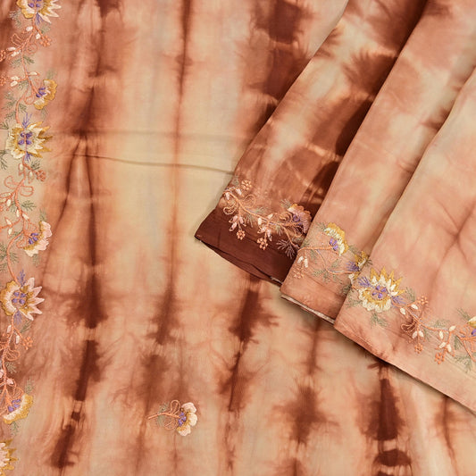 Indian Vintage Saree Brown & Beige Pure Crepe Silk Tie-Dye Embroidered Sari Fabric 5yard Sewing Floral Soft Zari