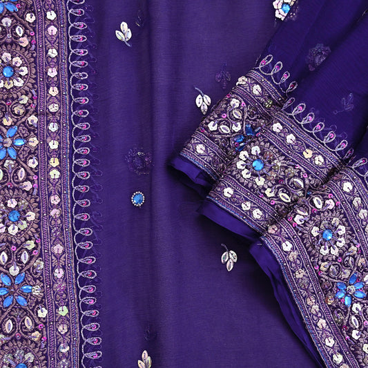 Indian Vintage Purple Pure Chiffon Silk Saree Printed Floral Design 5 Yards Sheer Soft Fabric for Sewing, Dressmaking,