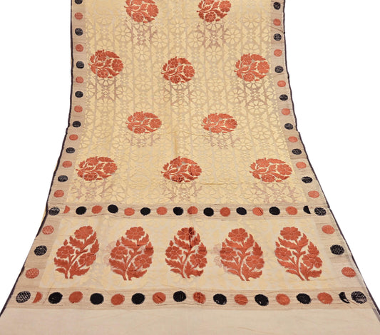 Indian Vintage Sarees Beige Pure Cotton Hand Woven Jamdani Sari 5yd Ethnic Floral Craft Fabric Dress making Upcycle Crafting Quilting
