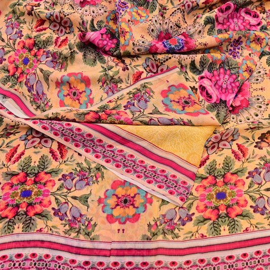 Vintage Sari Yellow 100% Pure Chiffon Silk Printed Sarees Sewing 5yd Craft Fabric Soft Dress Designing for Crafting Floral