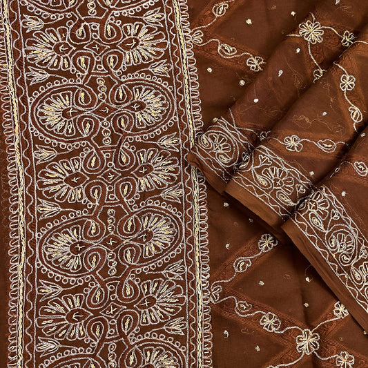 Indian Vintage Heavy Brown Dupatta Pure Chiffon silk Long Stole Hand Embroidered Scarves Floral Design Stole Veil Wrap Zari Zardozi