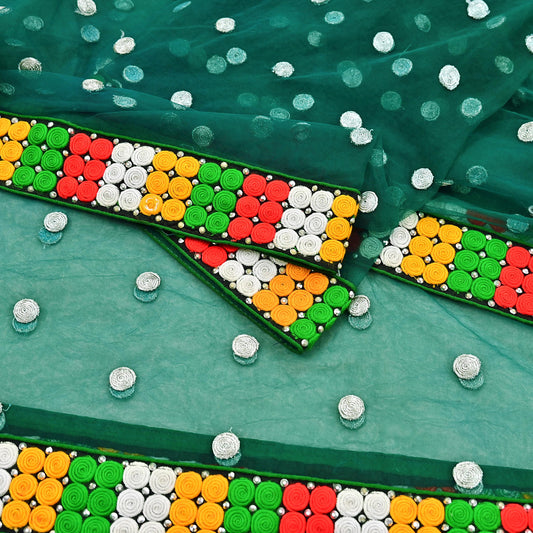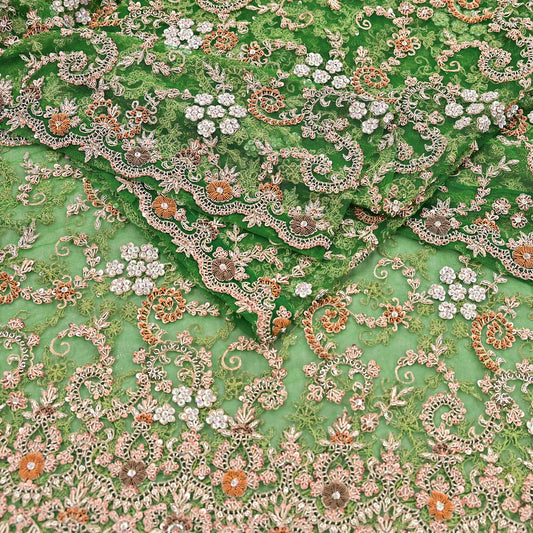 Indian Vintage Green Dupatta Net Mesh Long Stole Hand Embroidered Scarves Zari Sequins Stole
