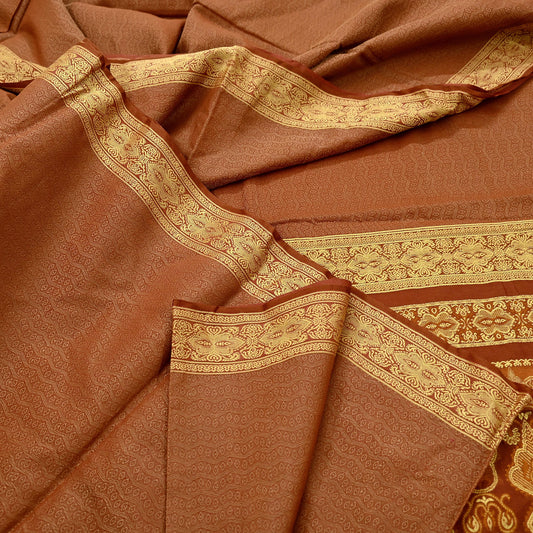 Indian Vintage Sari Brown Heavy Wedding Pure Satin Silk Woven Brocade Tanchoi Sarees Golden Zari 5Yd Dress Making Crafting Quilting