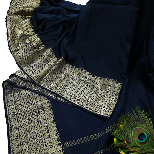 Indian Vintage Sari Deep Blue Mysore Silk Woven Sarees Craft Fabric 5Yd Ethnic South silk Dress Making Crafting Upcycle Quilting Zari Border