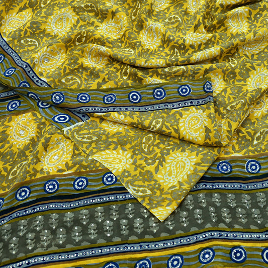 Indian Vintage Sari Gray & Yellow Pure Georgette Silk Printed Sarees 5Yd Craft Fabric Sewing Quilting Dress making Crafting Quilting Upcycle