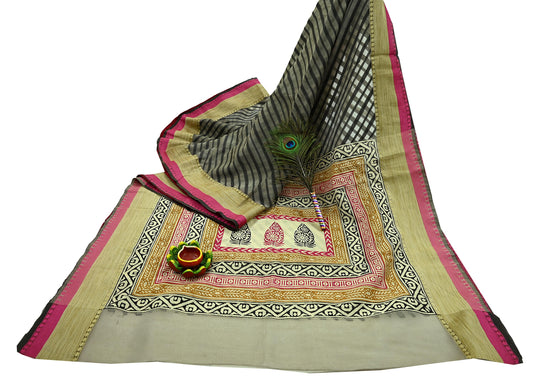 Indian Vintage Sari Gray & Beige 100% Pure Silk Hand Woven Sarees Craft Fabric 5Yd Ethnic Sewing Dress making Crafting Quilting Upcycle