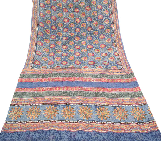 Indian Vintage Sari Gray & Blue Pure Silk Printed Saree Fabric 5yard Sewing Craft DressMaking Soft Floral Decor