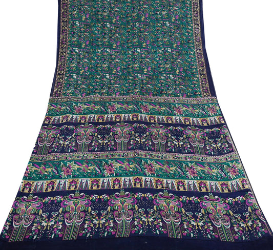 Indian Vintage Sari Green & Blue Pure Crepe Silk Printed Saree 5yard Sewing Floral Soft Craft Fabric Wrap