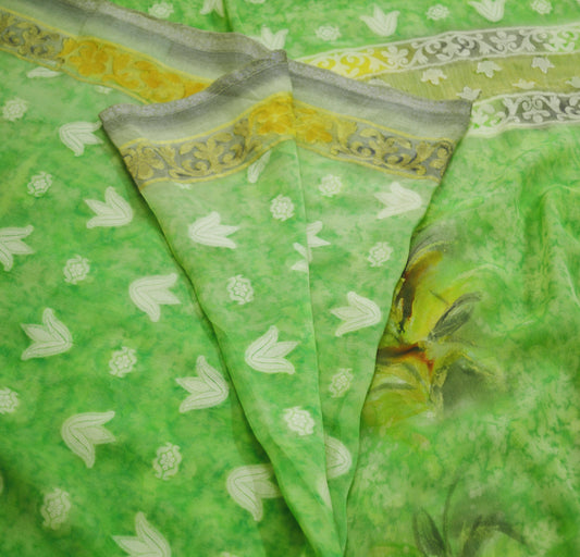Indian Vintage Sari Green Georgette Printed Sarees 5yd Sewing Craft Fabric Soft Crafting Dress Making Quilting Upcycle Used Bollywood sarees