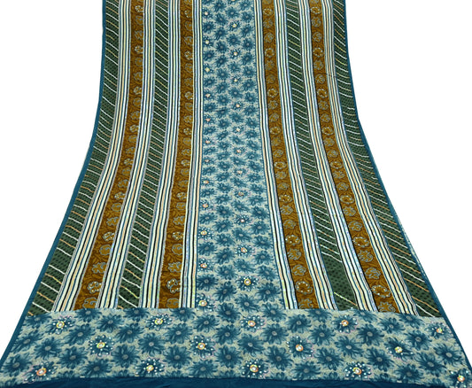 Indian Vintage Sari Ivory & Blue Pure Chiffon Silk Printed Sarees 6Yd Craft Fabric Sewing Soft Dress Making Upcycle Quilting