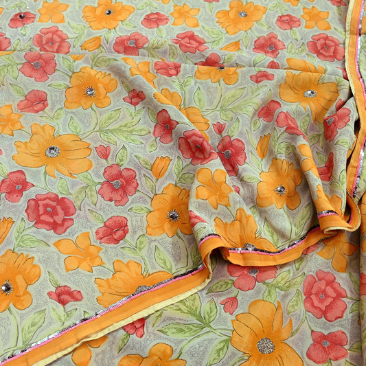 Indian Vintage Sari Ivory & Gray Pure Georgette Silk Printed Sarees Sewing 5yd Craft Soft Floral Dress Designing for Crafting