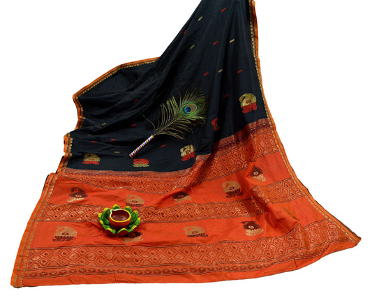 Indian Vintage Sari Orange & Black Mysore Silk Woven Sarees Fabric 5Yd Sari Ethnic Golden Zari Paisley Craft Fabric Dress making Quilting