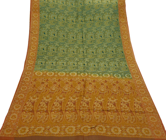 Indian Vintage Sari Orange & Green 100% Pure Silk Printed Saree Craft Fabric 5yd Sewing Dress Making Soft Wrap Quilting Crafting Upcycle