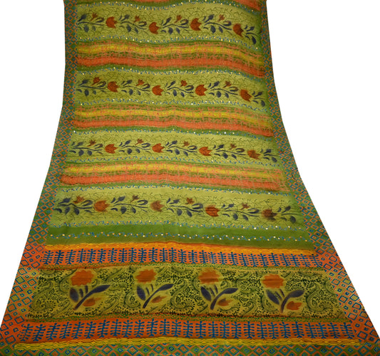 Indian Vintage Sari Orange & Green Pure Crepe Silk Hand Embroidered Saree 5yd Sewing Floral Craft Sequins Dress making Crafting Quilting