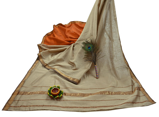 Indian Vintage Sari Orange & Beige Pure chanderi Silk Woven Sarees Craft Fabric 8Yd Soft Golden Zari Bollywood Sarees Crafting Upcycle