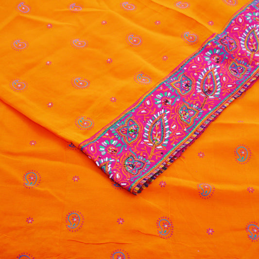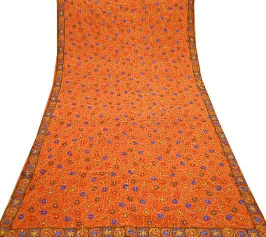 Indian Vintage Sari Orange Pure Crepe Silk Hand Embroidered Saree 5yard Sewing Floral Craft Sequins