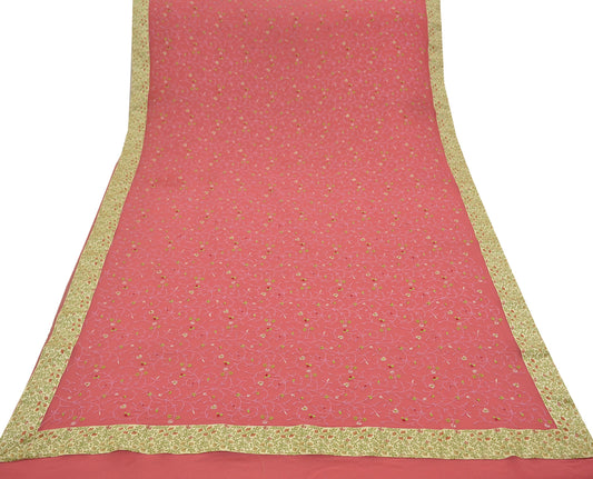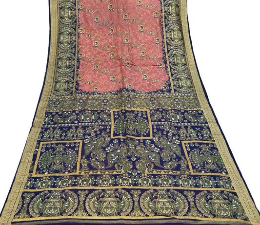 Indian Vintage Sari Peach Hand Embroidered Pure Georgette Silk Sarees Craft Fabric 5Yd Sequins Wedding Sarees Quilting Crafting Upcycle