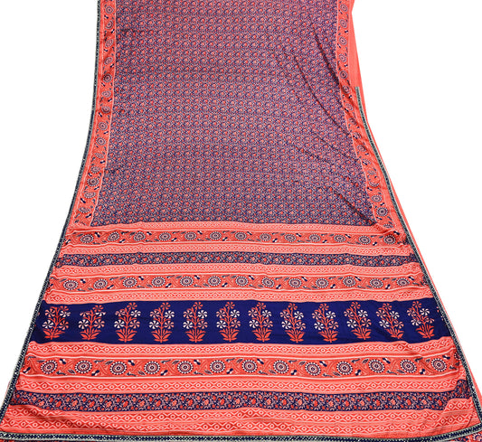 Indian Vintage Sari Peach & Blue Artificial silk Printed Sarees 5yd Craft Fabric Sewing Floral Soft Dress making Quilting Crafting Upcycle
